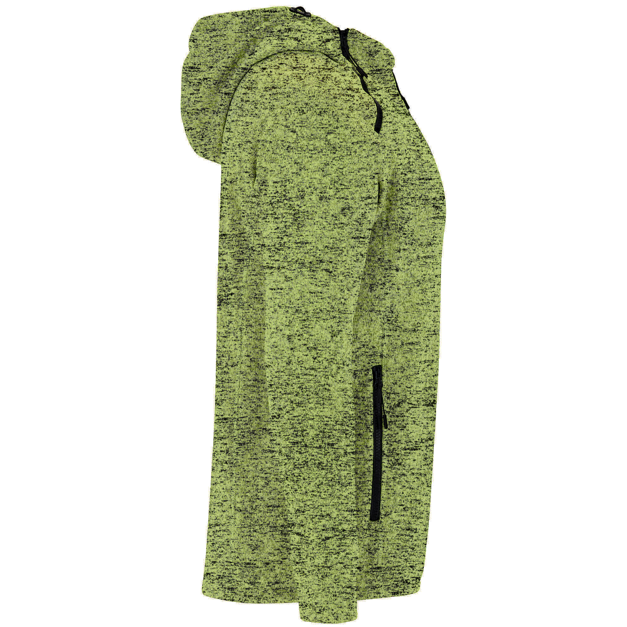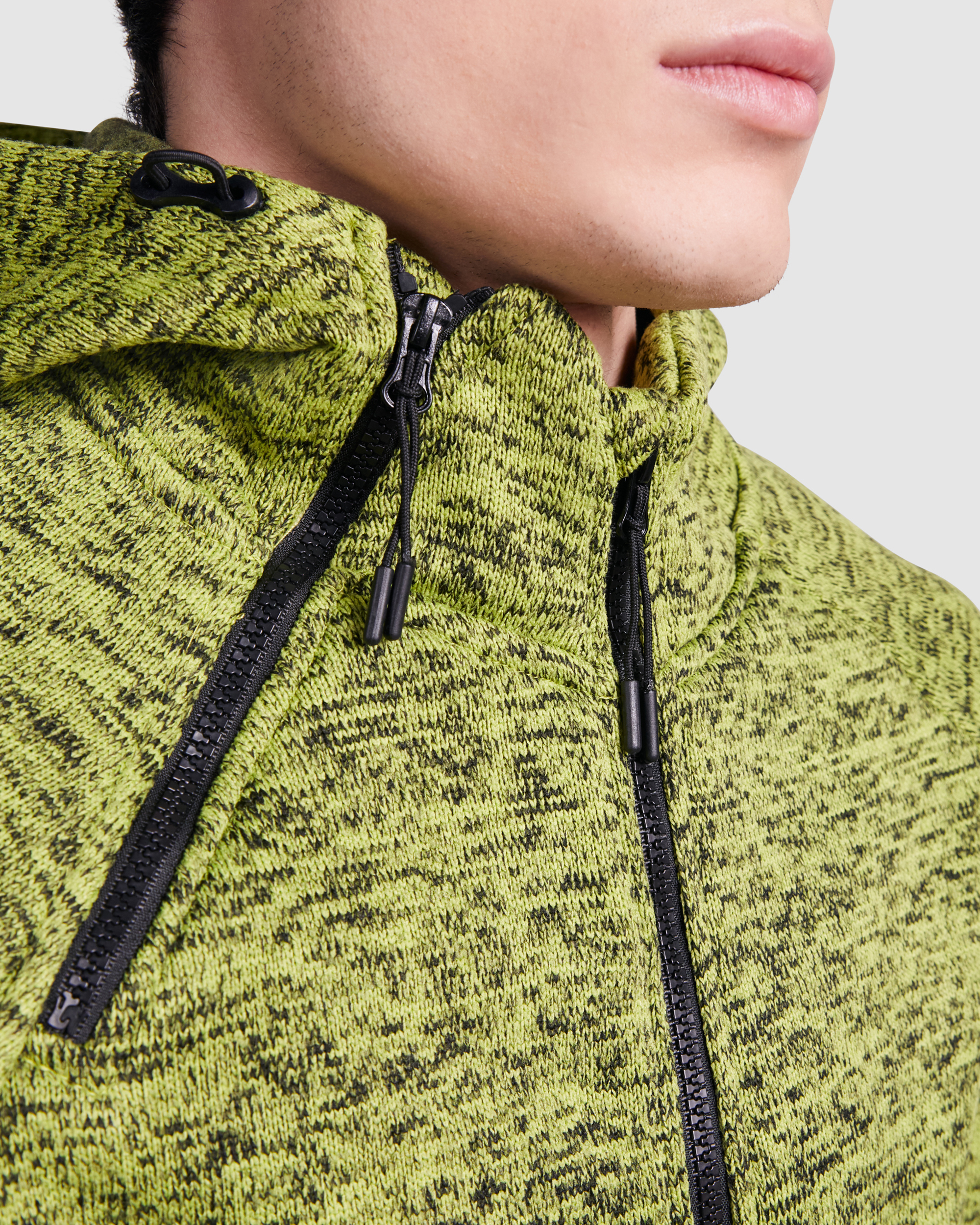 Felpa con cappuccio. Cerniere iniettate con tiretto di design, cerniera centrale con protettore per il mento e seconda cerniera decorativa sul collo per facilitare l’apertura. Collo alto con regolatori di design e copri cuciture interne. Due tasche frontali con cerniera.