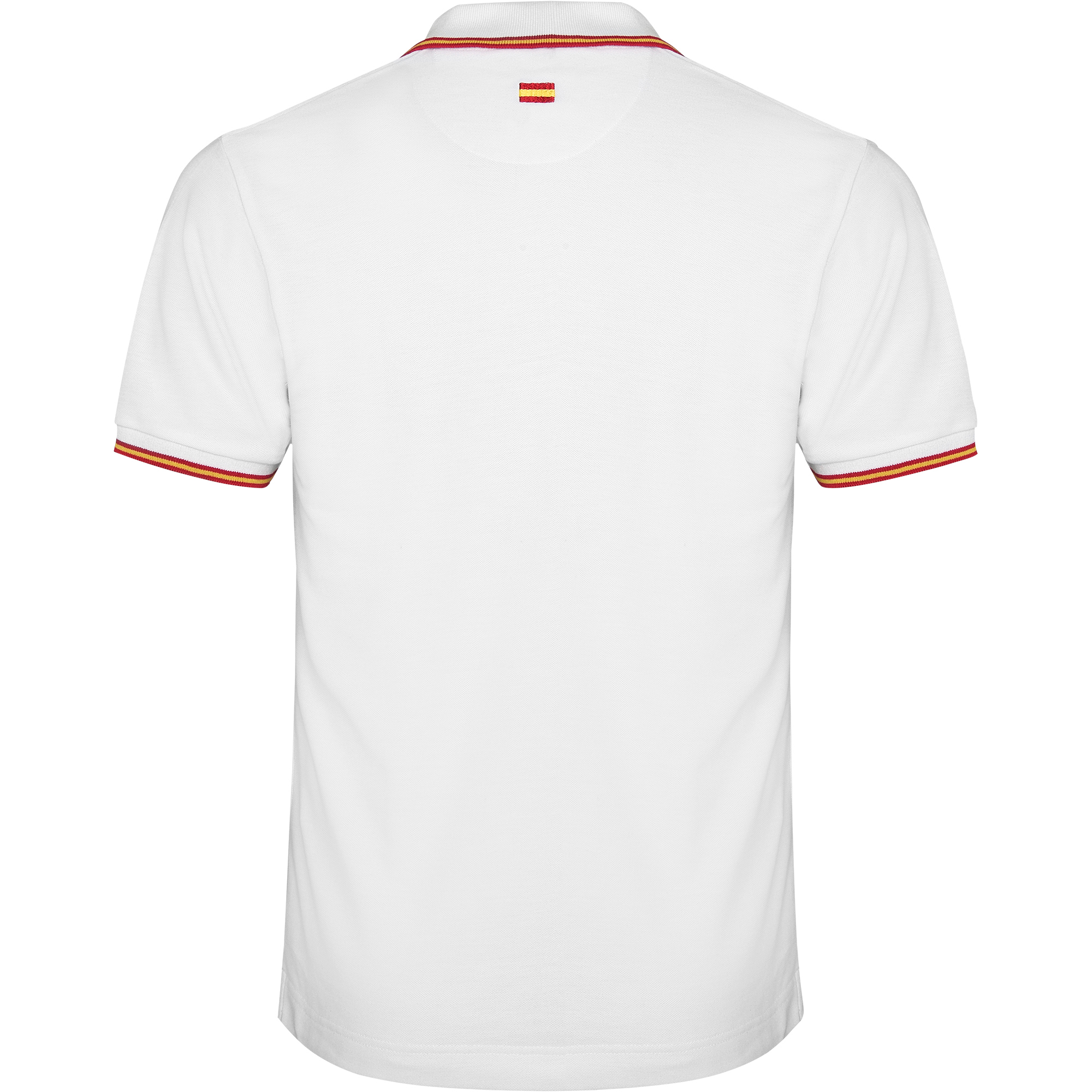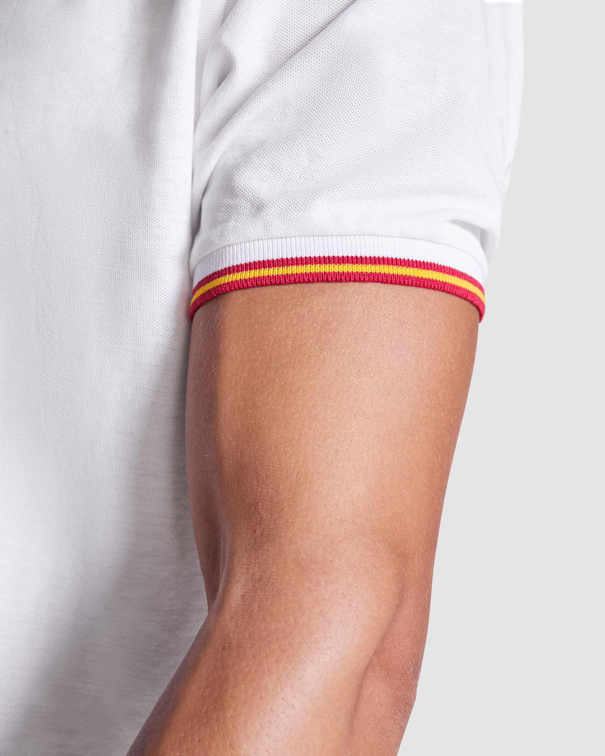 Polo a maniche corte con trattamento anti-pilling. Punto piqué. Colletto e maniche intrecciati a contrasto di colore 1×1. Chiusura a 3 bottoni. Scollo nastrato in tessuto coordinato e carré interno posteriore. Dettaglio bandiera ricamata sul retro. Tasca, opzionale. Lavabile a 60°C.